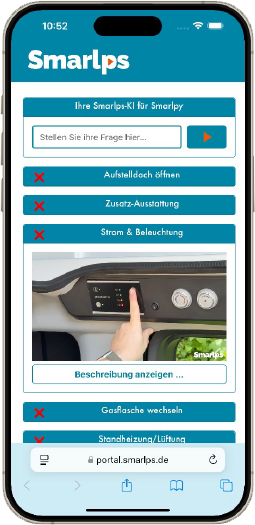Smarpls ist Ihr digitales Einweisungssystem, das den Alltag erleichtert. Mit gezielten Erklärvideos und Anleitungen ermöglicht es eine intuitive Bedienung komplexer Systeme wie Wohnmobile. Es reduziert den Aufwand bei der Fahrzeugübergabe und sorgt für Klarheit und Sicherheit.